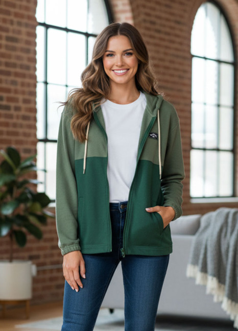 Zip front with dyed-to-match twill drawstrings. Long sleeves. Front slash pockets. Ribbed sleeve hems and bottom hem.