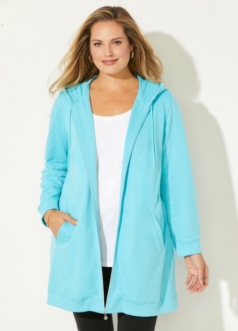 Zip front with dyed-to-match twill drawstrings. Long sleeves. Front slash pockets. Ribbed sleeve hems and bottom hem.